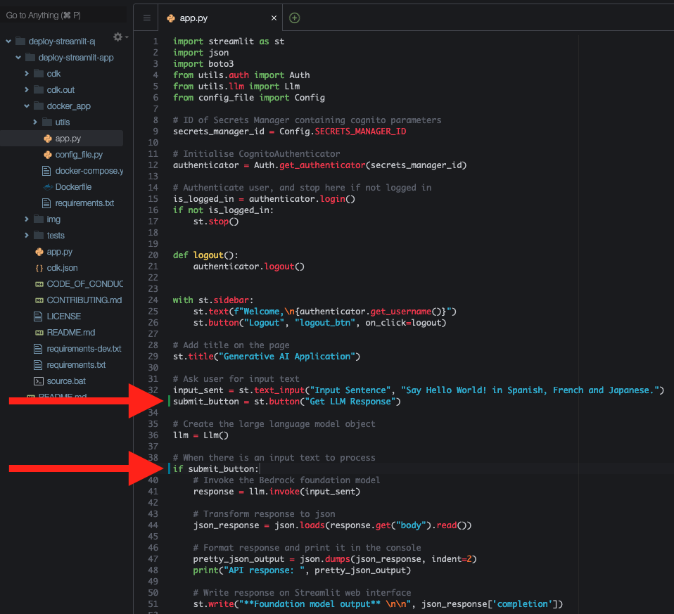 Let’s explore how you can customize the Streamlit application. Because the application is written in Python, you can modify it to integrate with different generative AI models, add new features, or change the UI to better align with your application’s requirements.