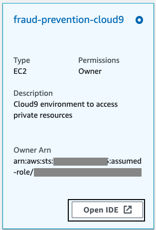 - On the AWS Cloud9 console, you should see an AWS Cloud9 environment provisioned by the CloudFormation template.