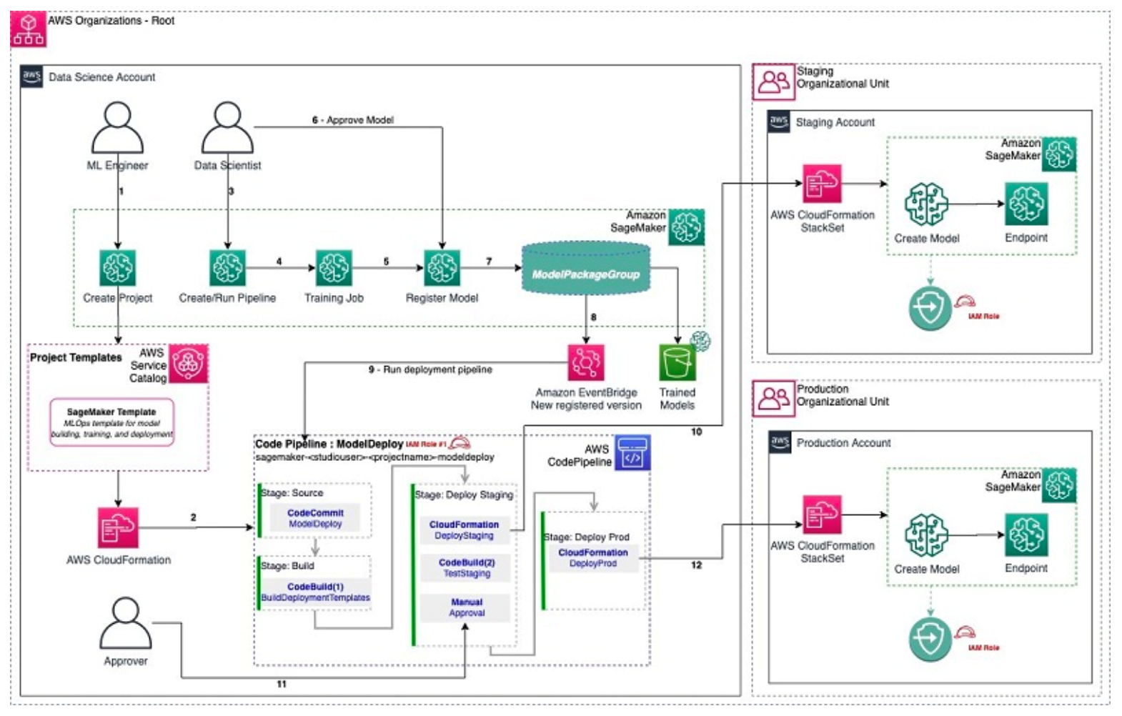 For detailed instruction on how to set up multi-account deployment using SageMaker Projects, refer to this blog.