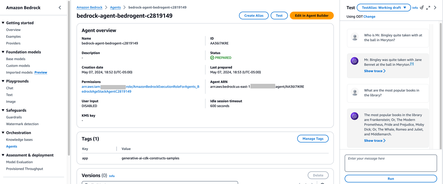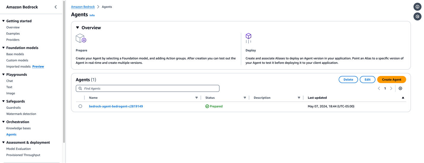 Navigate to the Agents page on the Amazon Bedrock console in your AWS Region and find your newly created agent. The AgentId can be found in the CloudFormation stack outputs section.