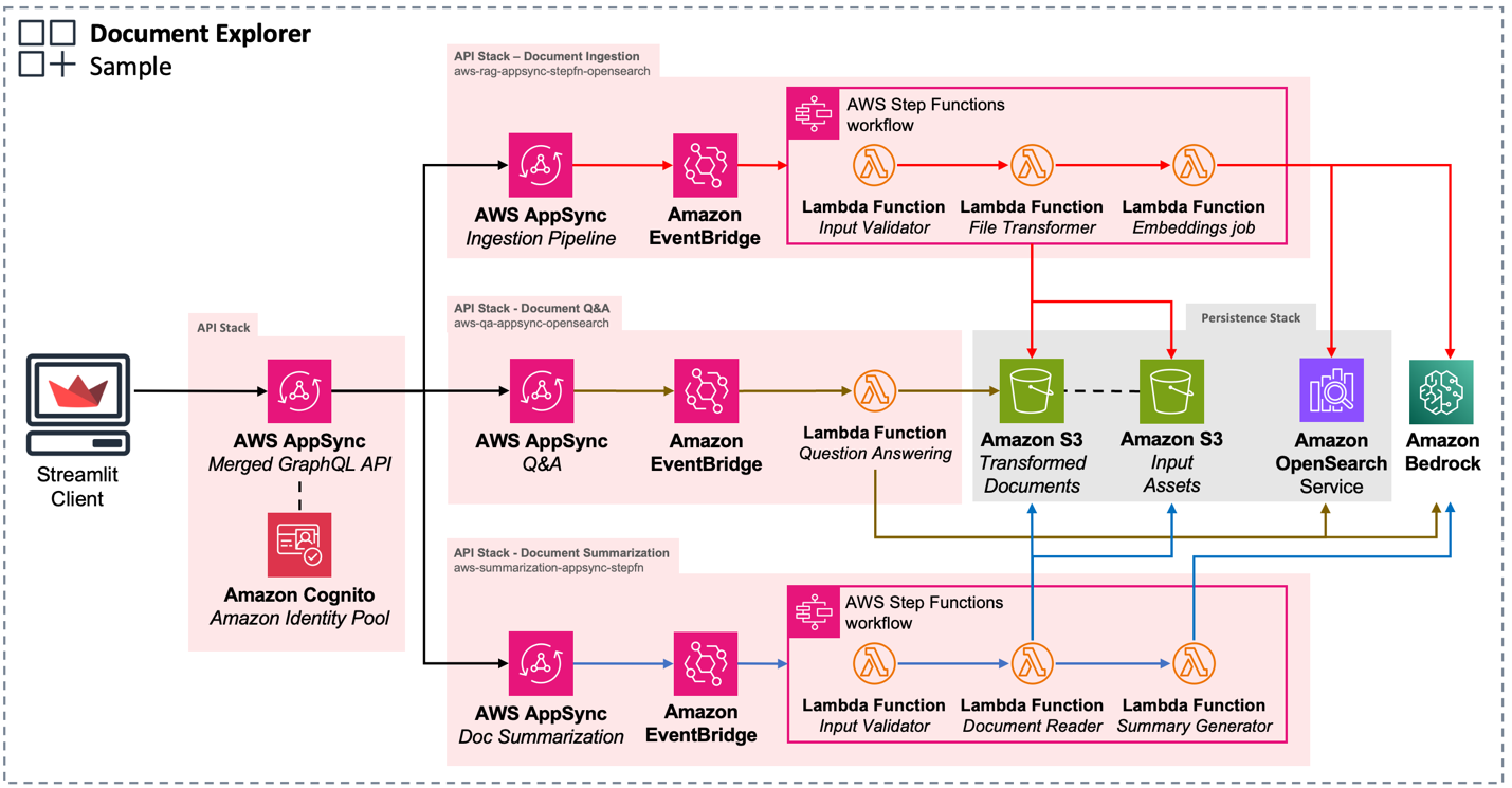 The Document Explorer sample generative AI application can help you quickly understand how to build end-to-end generative AI applications on AWS. It includes examples of key components needed in generative AI applications, such as: