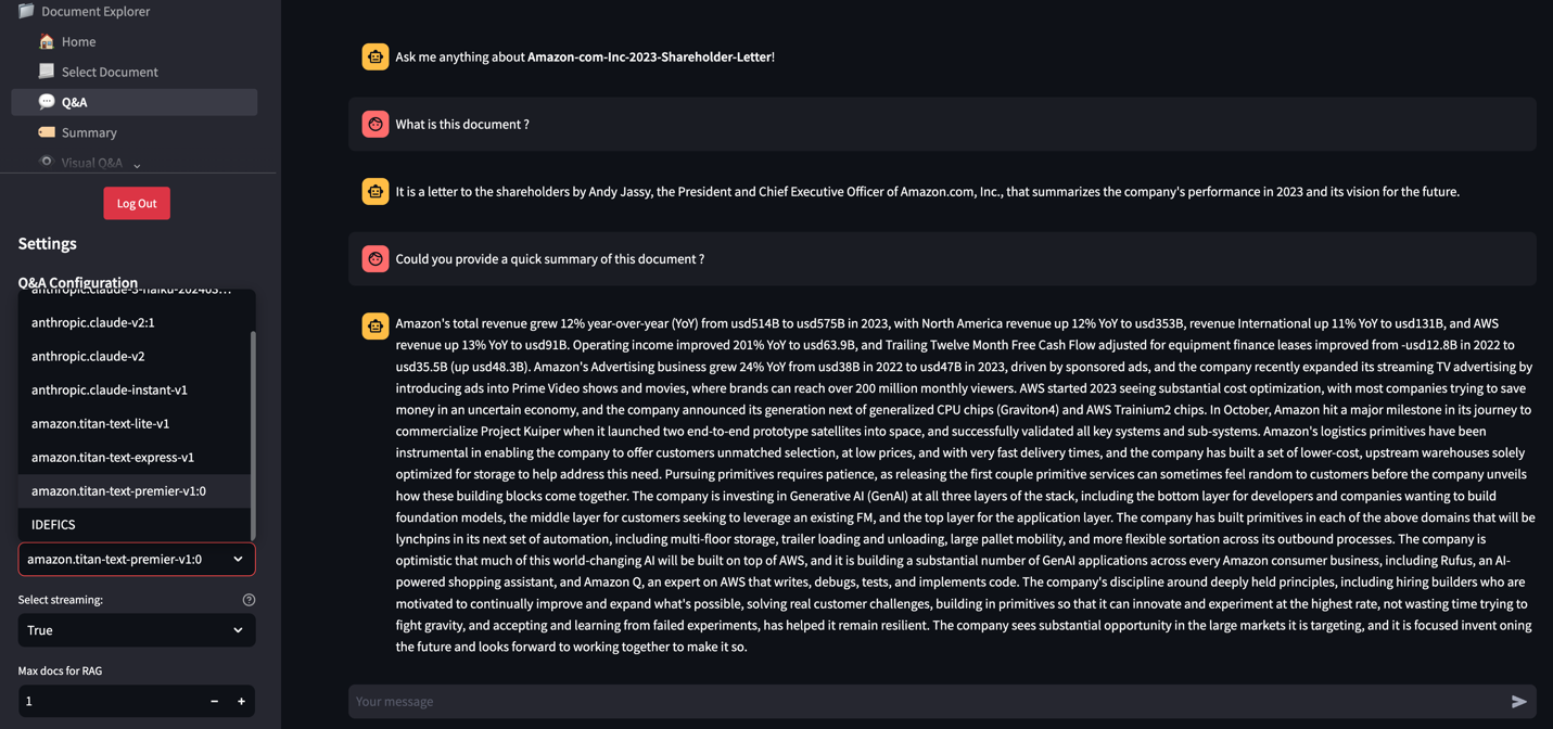 Choose Q&A in the navigation pane, and choose your preferred model (for this example, Amazon Titan Premier). You can now ask a question against the document you uploaded.