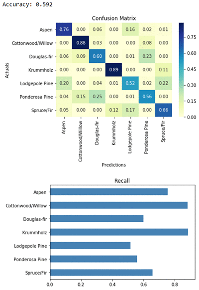 The recall achieved by our model varies widely among the classes. Recall is high for the most common labels, but is very poor for the rarer labels like Aspen or Cottonwood/Willow. Our predictions are right most of the time, but when the true cover type is a rare one like Aspen or Cottonwood/Willow, our model tends to predict wrong.