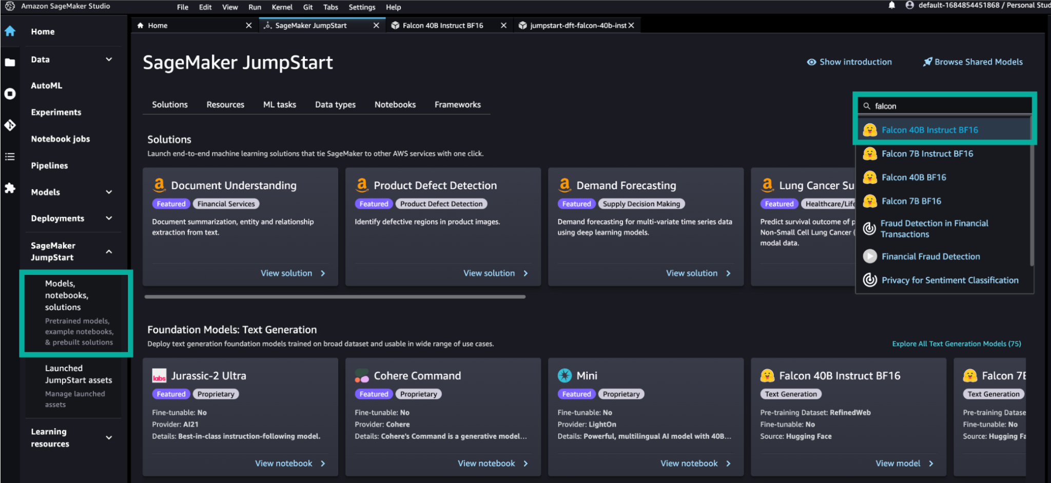 - Search for the Falcon-40b-instruct model on SageMaker JumpStart.