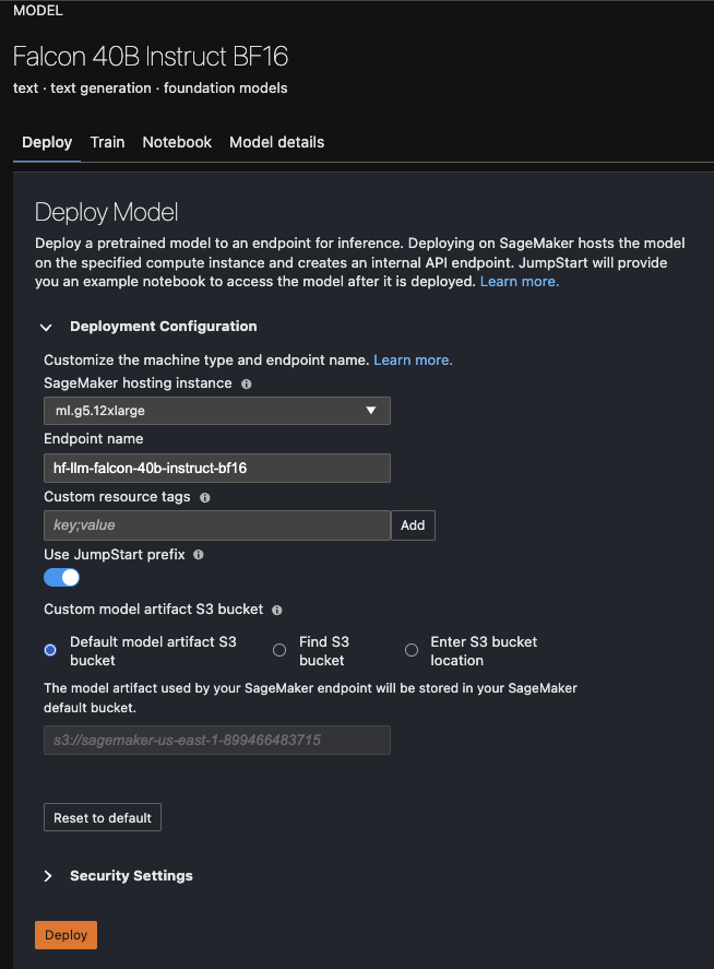 For model deployment, we use SageMaker JumpStart, which simplifies deploying models through a simple push of a button. Although we’ve used and tested Falcon-40b-instruct for this example, you may use any Hugging Face model available on SageMaker.