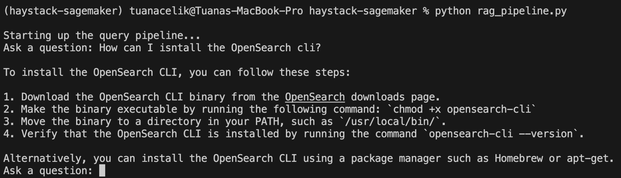 This will start a command line utility that waits for a user’s question. For example, let’s ask “How can I install the OpenSearch cli?”