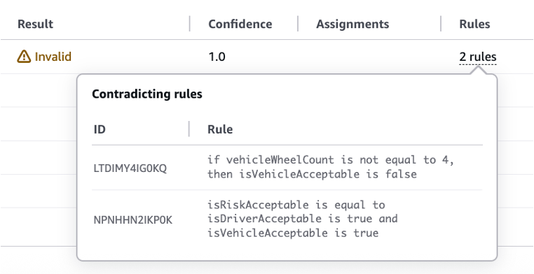 - The results of the Automated Reasoning check are shared with the user along with what rules, variables, and variable values were used in its determination, plus suggestions on what would make the assertion valid.