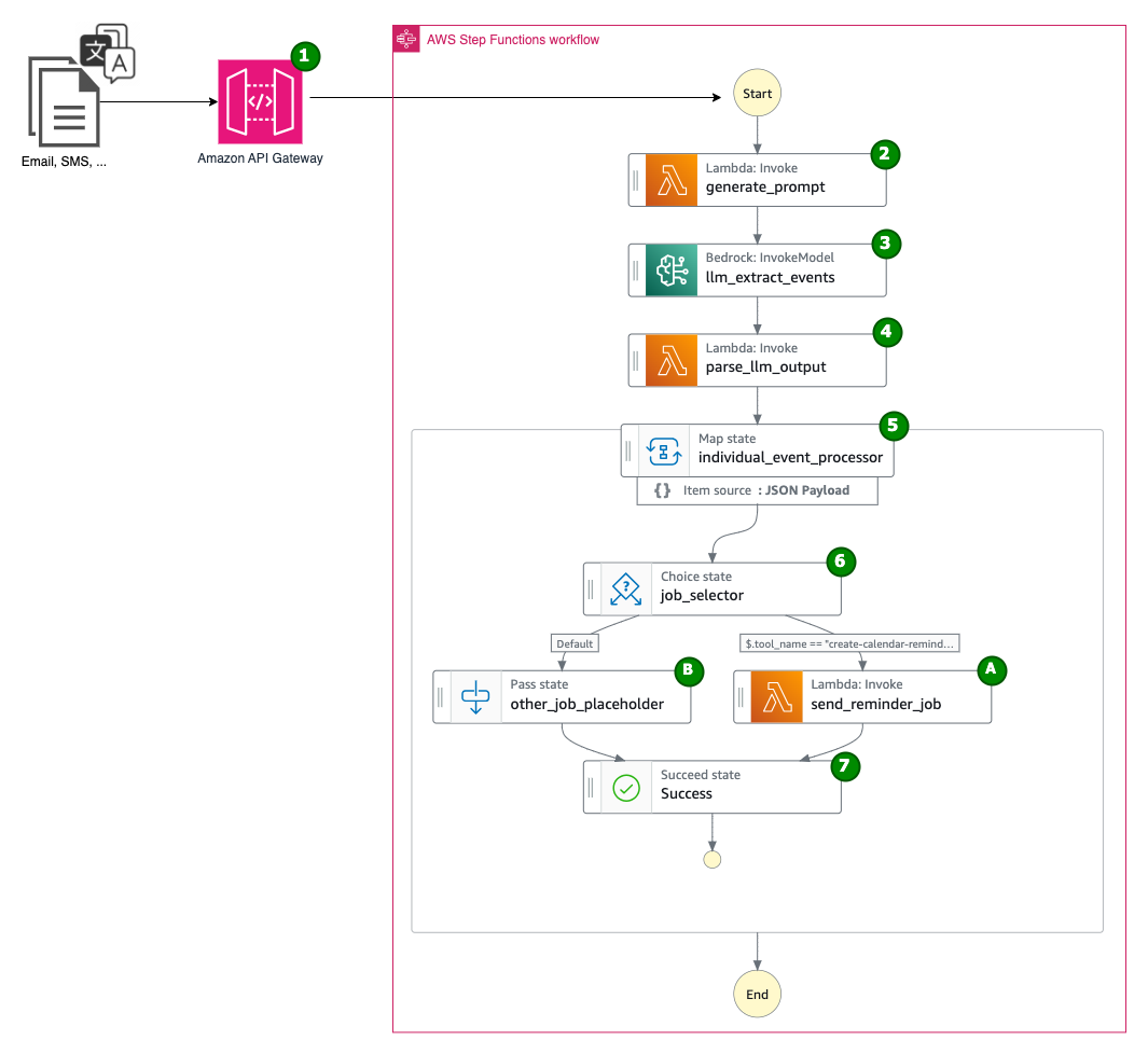Foreigners and expats living outside of their home country deal with a large number of emails in various languages daily. They often find themselves struggling with language barriers when it comes to setting up reminders for events like business gatherings and customer meetings. To solve this problem, this post shows you how to apply AWS services such as Amazon Bedrock, AWS Step Functions, and Amazon Simple Email Service (Amazon SES) to build a fully-automated multilingual calendar artificial intelligence (AI) assistant. It understands the incoming messages, translates them to the preferred language, and automatically sets up calendar reminders.