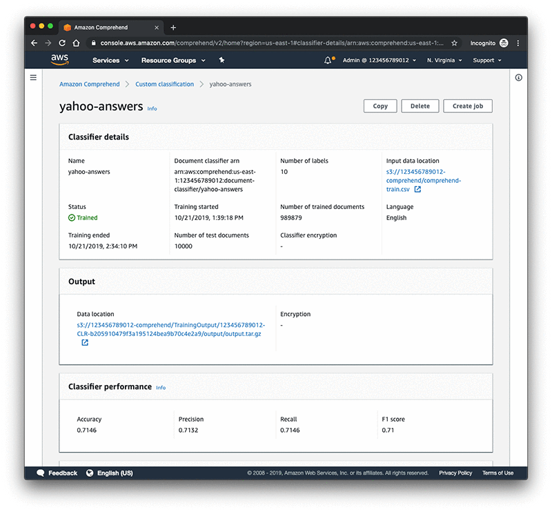 The following screenshot shows the view from the console (Comprehend > Custom Classification > yahoo-answers).