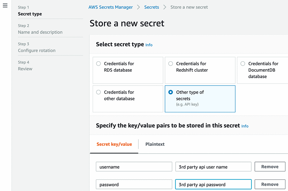 In this step, you use Secrets Manager to store third-party API credentials to protect the secrets. Complete the following steps: