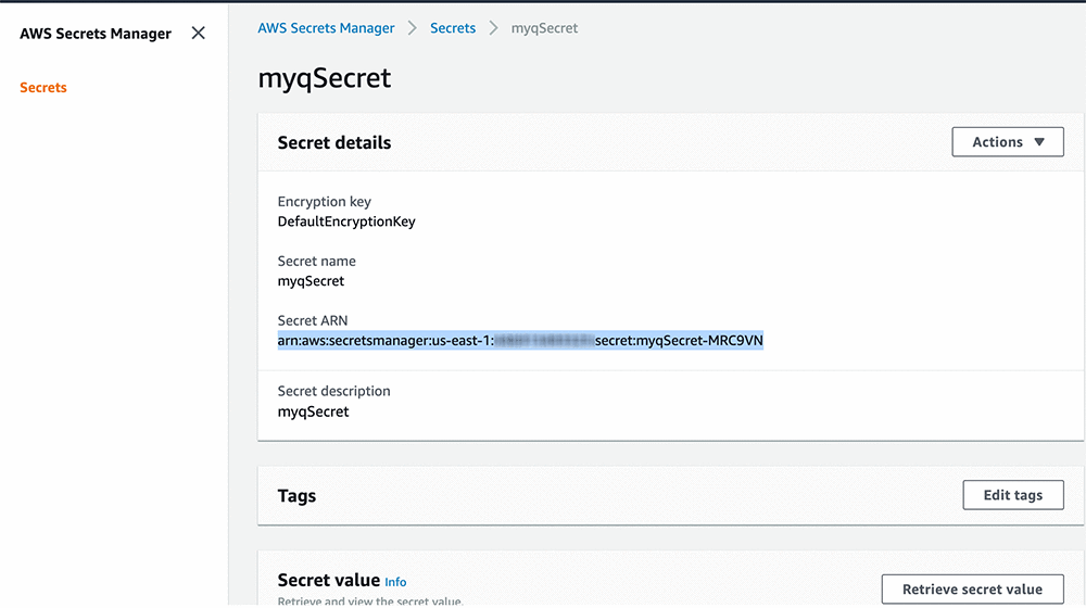 - After you create the secret, record the secret ARN, which is passed later as an environment variable for the Lambda function.