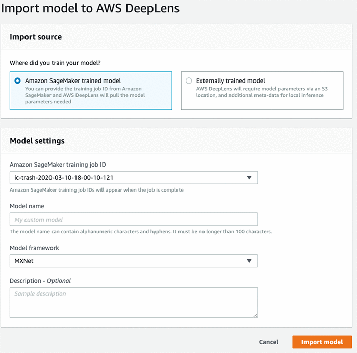 Select Amazon SageMaker trained model. Then selection your most recent job ID and model name. Then select MXNet as your model framework.