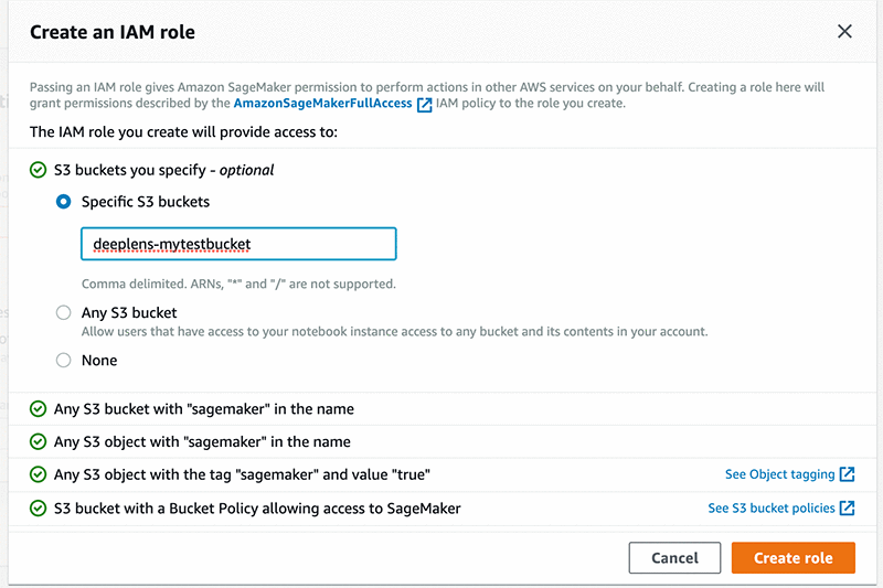 After you have the images you want to train your ML model on, upload them to Amazon S3. First, create an S3 bucket. For AWS DeepLens projects, the S3 bucket names must start with the prefix deeplens-.