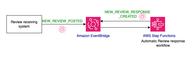 The application uses event-driven architecture (EDA), a powerful software design pattern that you can use to build decoupled systems by communicating through events. As soon as the product review is created, the review receiving system uses Amazon EventBridge to send an event that a product review is posted, along with the actual review content. The event starts an AWS Step Functions workflow. The workflow runs through a series of steps including generating content using an LLM and involving human decision making.
