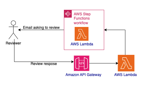 In the sample application, the send email for approval task includes a wait for the callback token. It invokes an AWS Lambda function with a token and waits for the token. The Lambda function builds an email message along with the link to an Amazon API Gateway URL. Lambda then uses Amazon Simple Notification Service (Amazon SNS) to send an email to a human reviewer. The reviewer reviews the content and either accepts or rejects the message by selecting the appropriate link in the email. This action invokes the Step Functions SendTaskSuccess API. The API sends back the task token and a status message of whether to accept or reject the review. Step Functions receives the token, resumes the send email for approval task and then passes control to the choice state. The choice state decides whether to go through acceptance or rejection of the review based on the status message.
