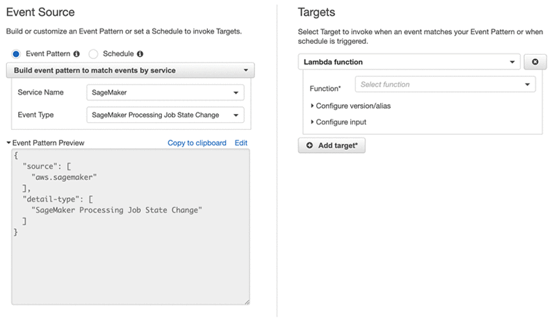 Amazon SageMaker Processing jobs are also supported in EventBridge. The EventBridge integration allows you to monitor status changes of your processing jobs and automatically trigger actions. You can do so by configuring the EventBridge rule to match on Amazon SageMaker Processing events. When the pattern matches, the rule routes that event to the target. You can configure this on the Amazon CloudWatch console. Complete the following steps: