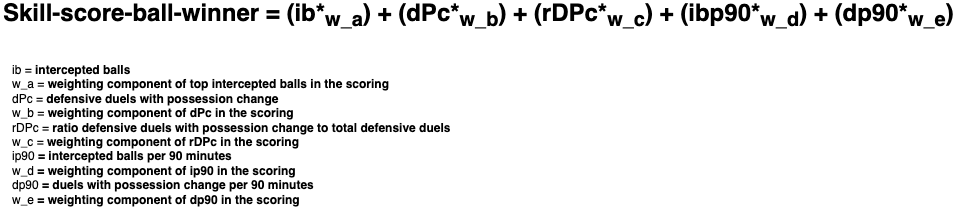 A player with this ability causes ball losses to the opposing team, both in total and respective to his playing time. He wins a high number of ground and aerial duels, and he steals or intercepts the ball often, creating a safe ball control himself, and a possibility for his team to counterattack.