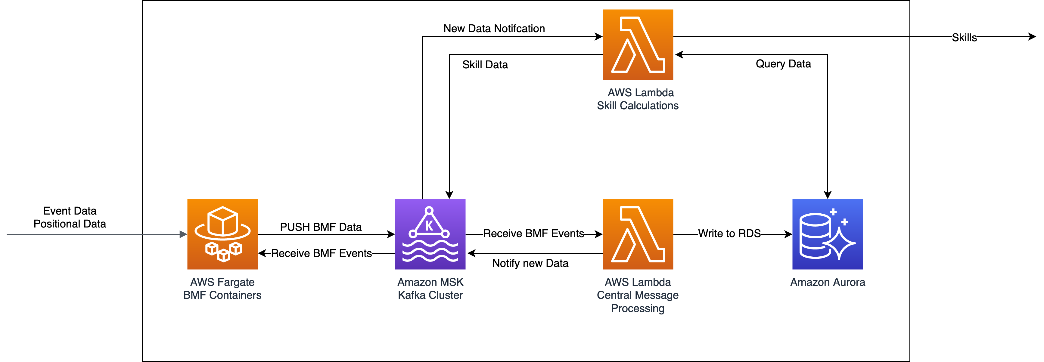 Bundesliga Match Facts that have been developed up to this point are independent from one another and rely only on the ingestion of positional and event data, as well as their own calculations. However, this changes for the new Bundesliga Match Fact Skill, which calculates skill rankings based on data produced by existing Match Facts, as for example xGoals or xPass. The outcome of one event, possibly an incredible goal with low chances of going in, can have a significant impact on the finisher skill ranking. Therefore, we built an architecture that always provides the most up-to-date skill rankings whenever there is an update to the underlying data. To achieve real-time updates to the skills, we use Amazon MSK, a managed AWS service for Apache Kafka, as a data streaming and messaging solution. This way, different Bundesliga Match Facts can communicate the latest events and updates in real time.