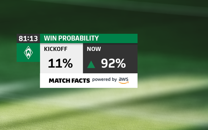 The new Bundesliga Match Fact is the result of an in-depth analysis by the Bundesliga’s football experts and AWS data scientists. Win probabilities are shown in the live ticker of the respective matches in the official Bundesliga app. During a broadcast, win probabilities are provided to commentators through the data story finder and visually shown to fans at key moments, such as when the underdog takes the lead and is now most likely to win the game.