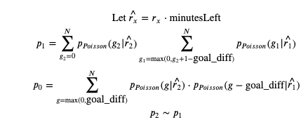 The live model is trained using a neural network architecture and uses a Poisson distribution approach to predict a goals-per-minute-rate r for each team, as described in the following equation: