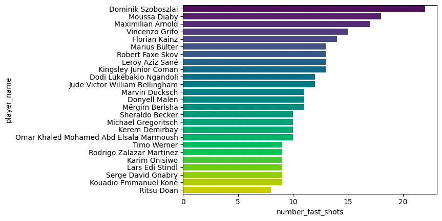 We analyzed around 215 matches from the Bundesliga 2022–2023 season. The following plot shows the number of fast shots (>100 km/h) by player. The 263 players with at least one fast shot (>100 km/h) have, on average, 3.47 fast shots. As the graph shows, some players have a frequency way above average, with around 20 fast shots.