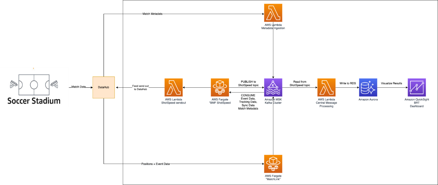 Match-related data is gathered and brought into the system via DFL’s DataHub. To process match metadata, we use an AWS Lambda function called MetaDataIngestion, while positional data is brought in using an AWS Fargate container known as MatchLink. These Lambda functions and Fargate containers then make this data available for further use in the appropriate MSK topics.