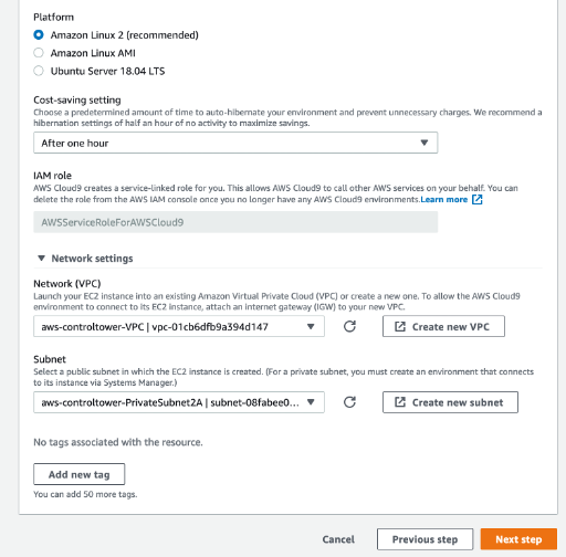 - Specify your AWS Identity and Access Management (IAM) role, VPC, and subnet.