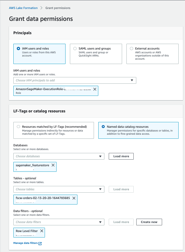 You can implement row-level and cell-level security by creating data filters. You select a data filter when you grant the SELECT Lake Formation permission on tables. In this case, we use this capability to implement a set of filters that limit access to feature groups and specific features within a feature group.