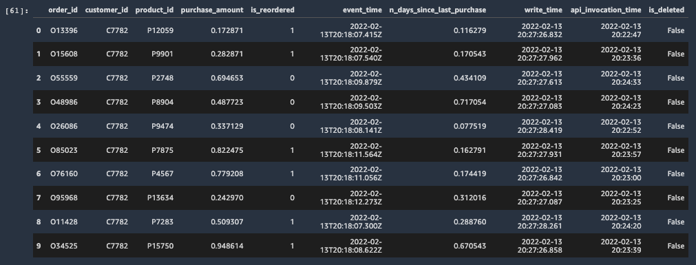 First, you test row-level access by creating an Athena query for your feature group orders with the following code. The table_name is the AWS Glue table that is automatically generated by Feature Store.