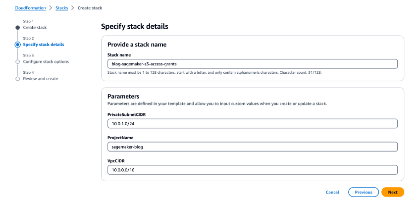 blog-sagemaker-s3-access-grants). - Under Parameters, provide the following information: