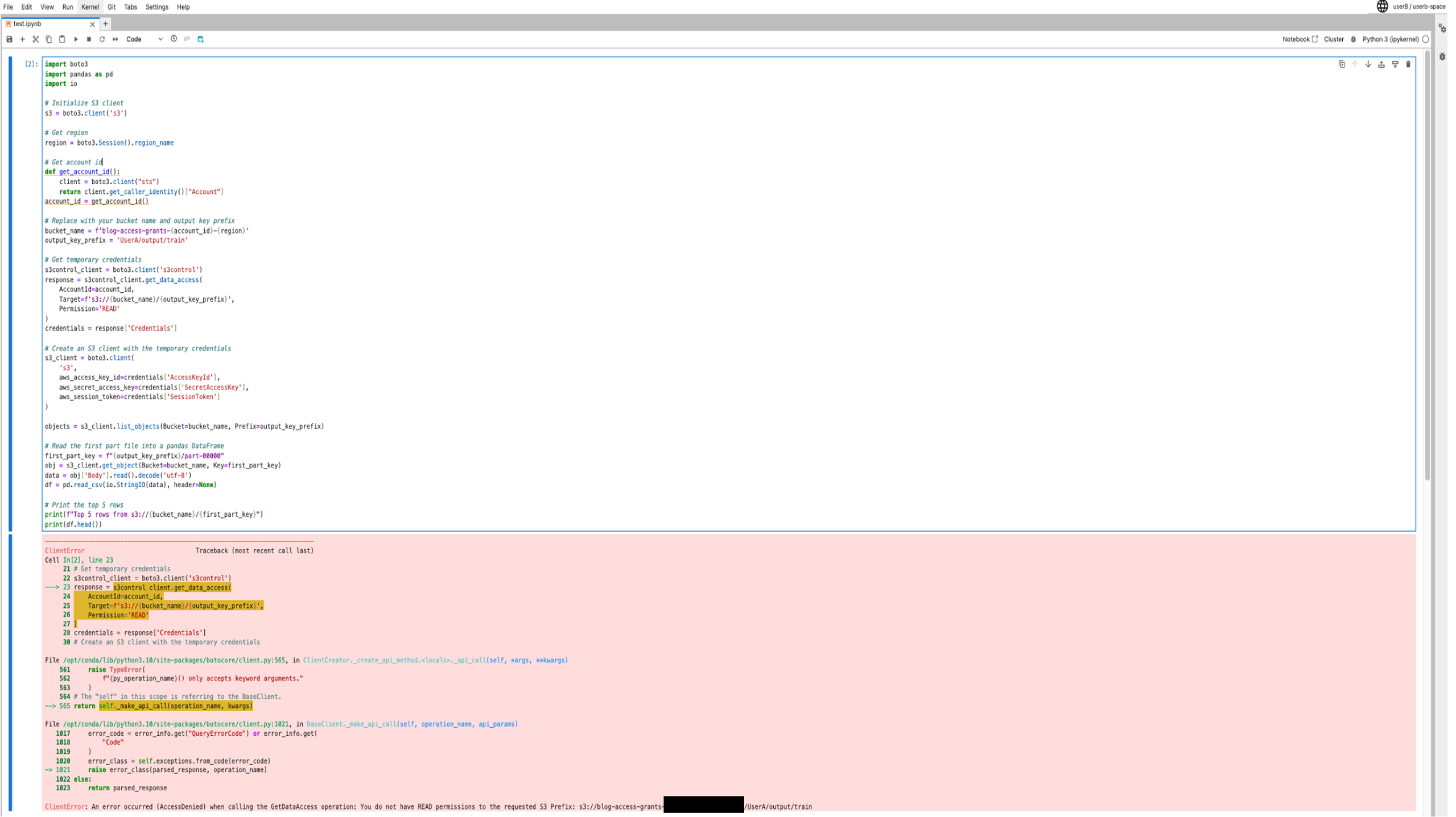 This script uses the access grants to obtain temporary credentials, reads the first part file (import boto3 import pandas as pd import io # Initialize S3 client s3 = boto3.client('s3') # Get region region = boto3.Session().region_name # Get account id def get_account_id(): client = boto3.client("sts") return client.get_caller_identity()["Account"] account_id = get_account_id()