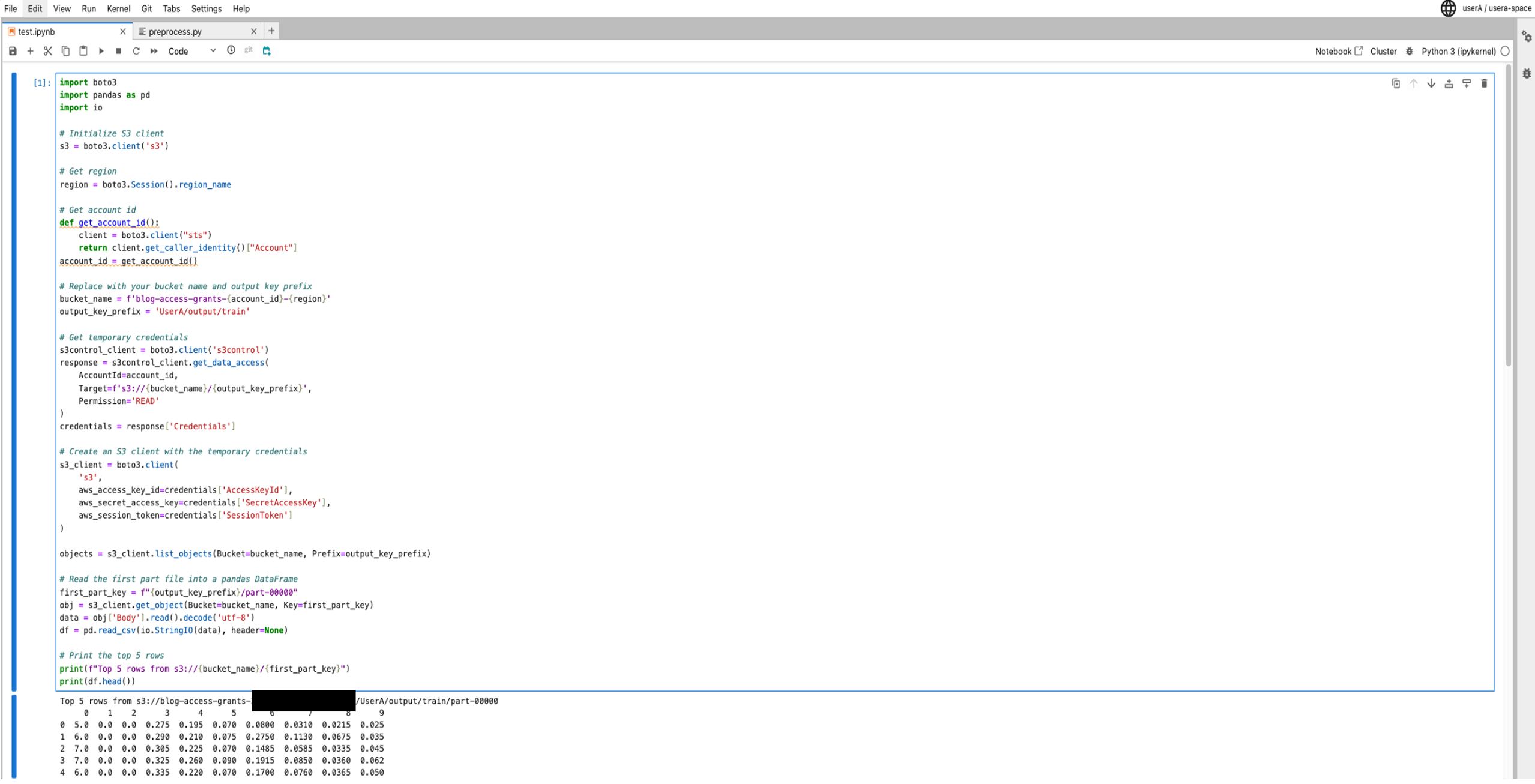 This script uses the access grants to obtain temporary credentials, reads the first part file (import boto3 import pandas as pd import io # Initialize S3 client s3 = boto3.client('s3') # Get region region = boto3.Session().region_name # Get account id def get_account_id(): client = boto3.client("sts") return client.get_caller_identity()["Account"] account_id = get_account_id()