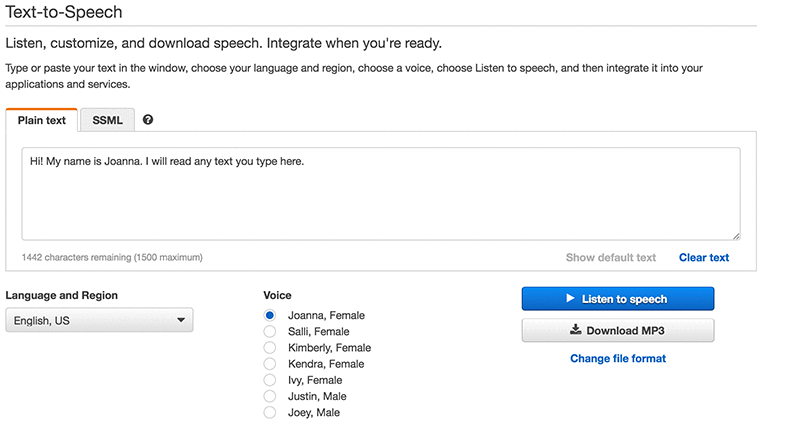 2. To try the Amazon Polly service, in the Plain text tab, paste your text and listen the output.