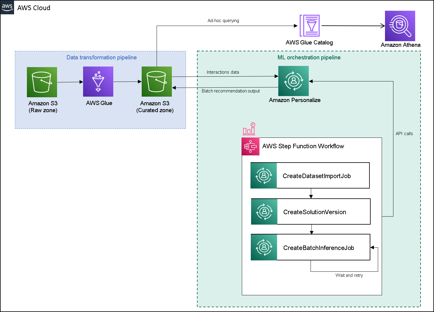 Data preparation is very important to ensure we get customer behavior data into a format that is ready for Amazon Personalize. The architecture described in this post uses AWS Glue, a serverless data integration service, to perform the transformation of raw data into a format that is ready for Amazon Personalize to consume. The solution uses Amazon Personalize to create batch recommendations for all users by using a batch inference. We then use a Step Functions workflow so that the automated workflow can be run by calling Amazon Personalize APIs in a repeatable manner.