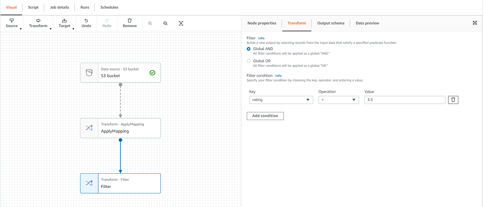 - To do so, remove the last node called S3 bucket and add a filter node on the Transform tab.