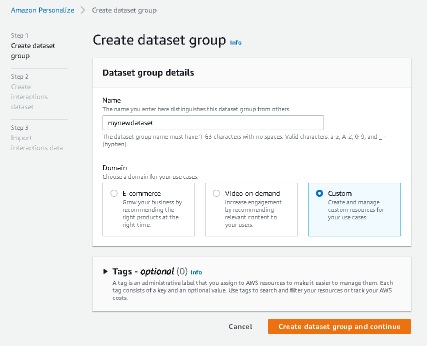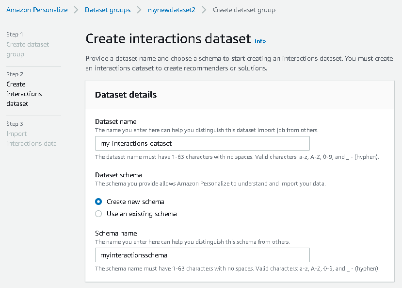 With our interactions dataset and user input data in the right format, we can now create our Amazon Personalize solution. In this section, we create our dataset group, import our data, and then create a batch inference job. A dataset group organizes resources into containers for Amazon Personalize components.