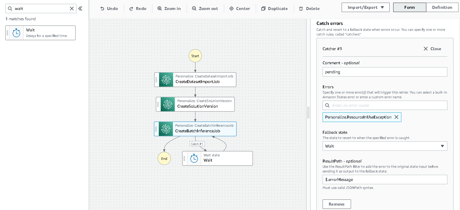 Personalize.ResourceInUseException. - For Fallback state, choose Wait.