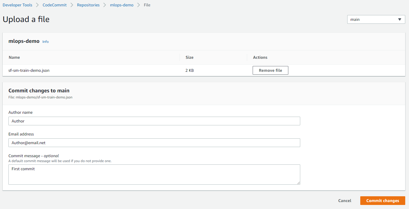 On to the CodeCommit page select the repository created by AWS CloudFormation. Upload the sf-sm-train-demo.json file into the empty repository. The sf-sm-train-demo.json file should be updated with the values from the AWS CloudFormation template outputs. Provide a name, email, and optional message to the main branch and Commit changes.