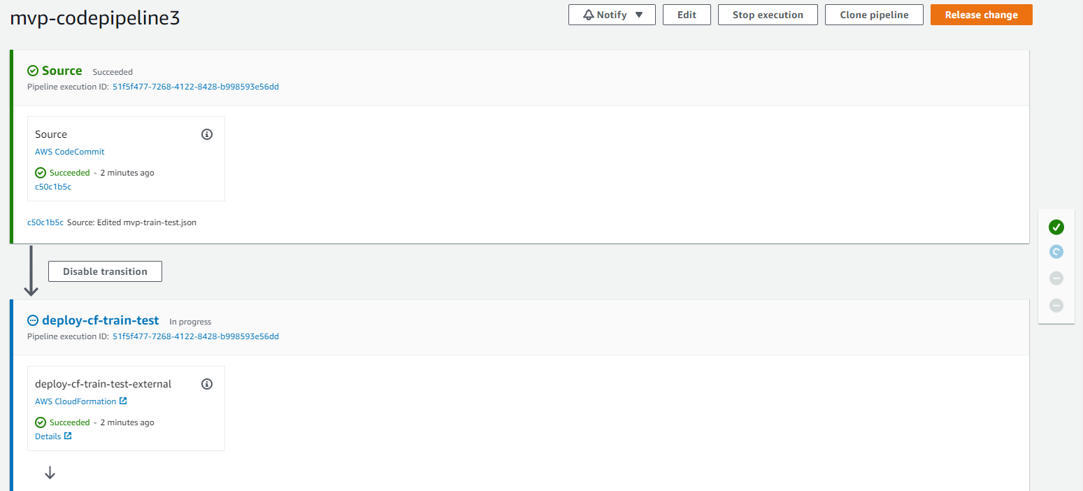 After a successful response, the custom deploy-cf-train-test stage creates an AWS CloudFormation template in the training account. You can check the CodePipeline status in the console.