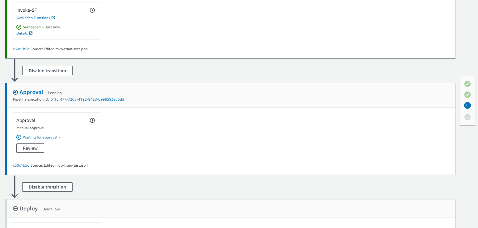 - CodePipeline waits for manual approval before the final stage of the pipeline to validate training results and ready for production.
