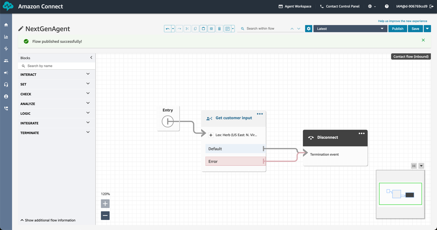 - After it’s published, choose Show additional flow information at the bottom of the navigation panel. Copy the flow’s Amazon Resource Name (ARN), which you will need to deploy the WhatsApp integration. The following screenshot shows the Amazon Connect console with the flow.