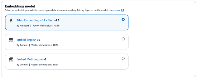 - Create a knowledge base that will split your data into chunks and generate embeddings using the Amazon Titan Embeddings model. As part of this process, Amazon Bedrock Knowledge Bases automatically creates an Amazon OpenSearch Serverless vector search collection to hold your vectorized data.