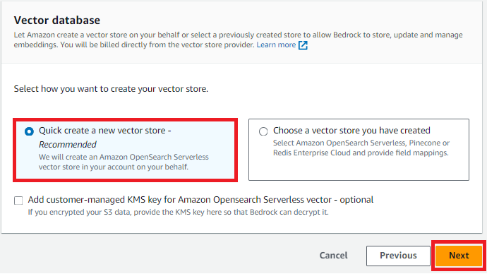 - Select Quick create a new vector store to create a new OpenSearch Serverless vector store to store the vectorized content.