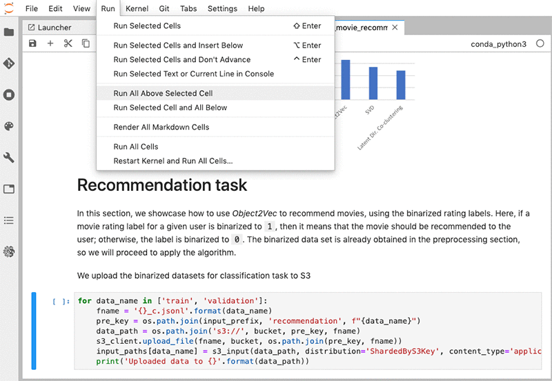 2. Starting from the top, use your notebook to execute all cells in order until you get to just before the Recommendation task section (which is about three-quarters of the way down the notebook).