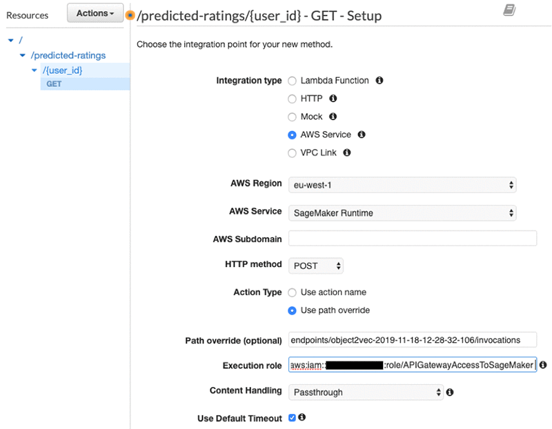 The next step is to create a GET method on the resource path /predicted-ratings/{user_id} and integrate it with your Amazon SageMaker endpoint. Complete the following steps: