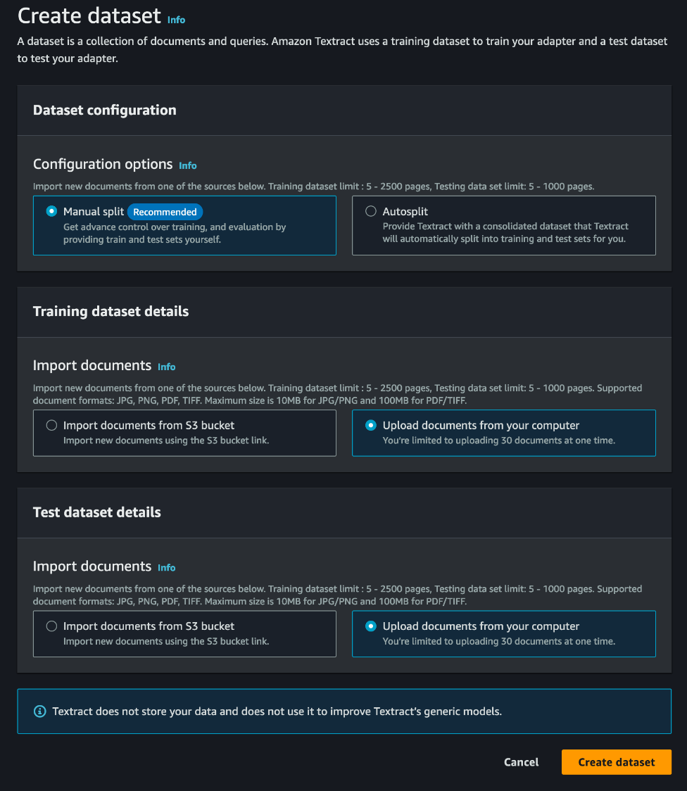 The initial phase in adapter generation involves the careful selection of an appropriate set of sample documents for annotation, training, and testing. We have an option to auto split the documents into test and train datasets; however, for this process, we manually split the dataset.