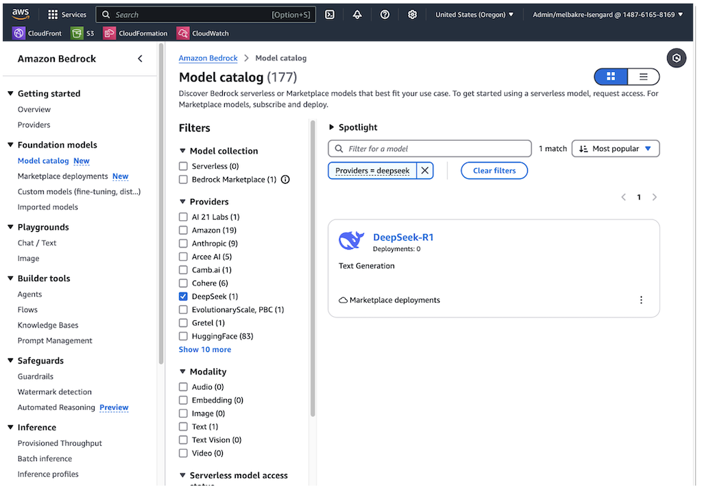 Amazon Bedrock Marketplace gives you access to over 100 popular, emerging, and specialized foundation models (FMs) through Amazon Bedrock. To access DeepSeek-R1 in Amazon Bedrock, complete the following steps:
