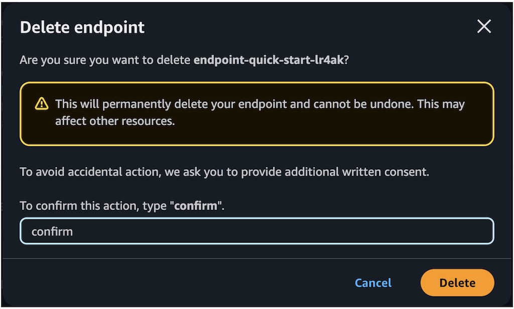 - Choose Delete to delete the endpoint.