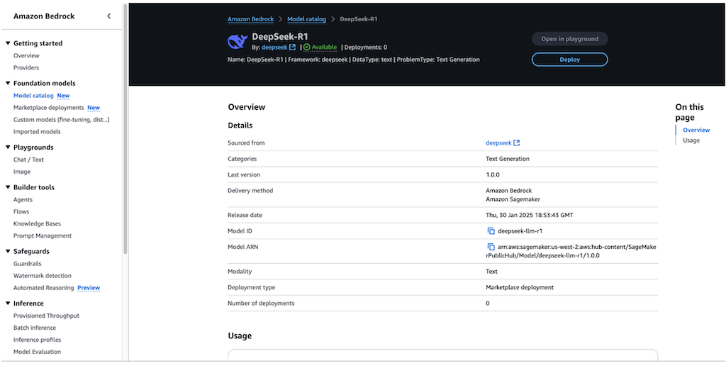 The page also includes deployment options and licensing information to help you get started with DeepSeek-R1 in your applications. - To begin using DeepSeek-R1, choose Deploy.
