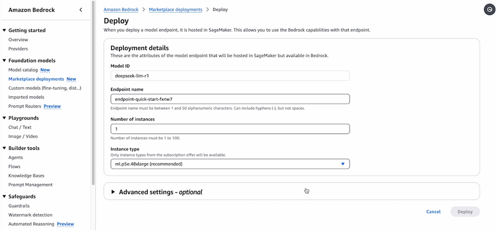 You will be prompted to configure the deployment details for DeepSeek-R1. The model ID will be pre-populated. - For Endpoint name, enter an endpoint name (between 1–50 alphanumeric characters).